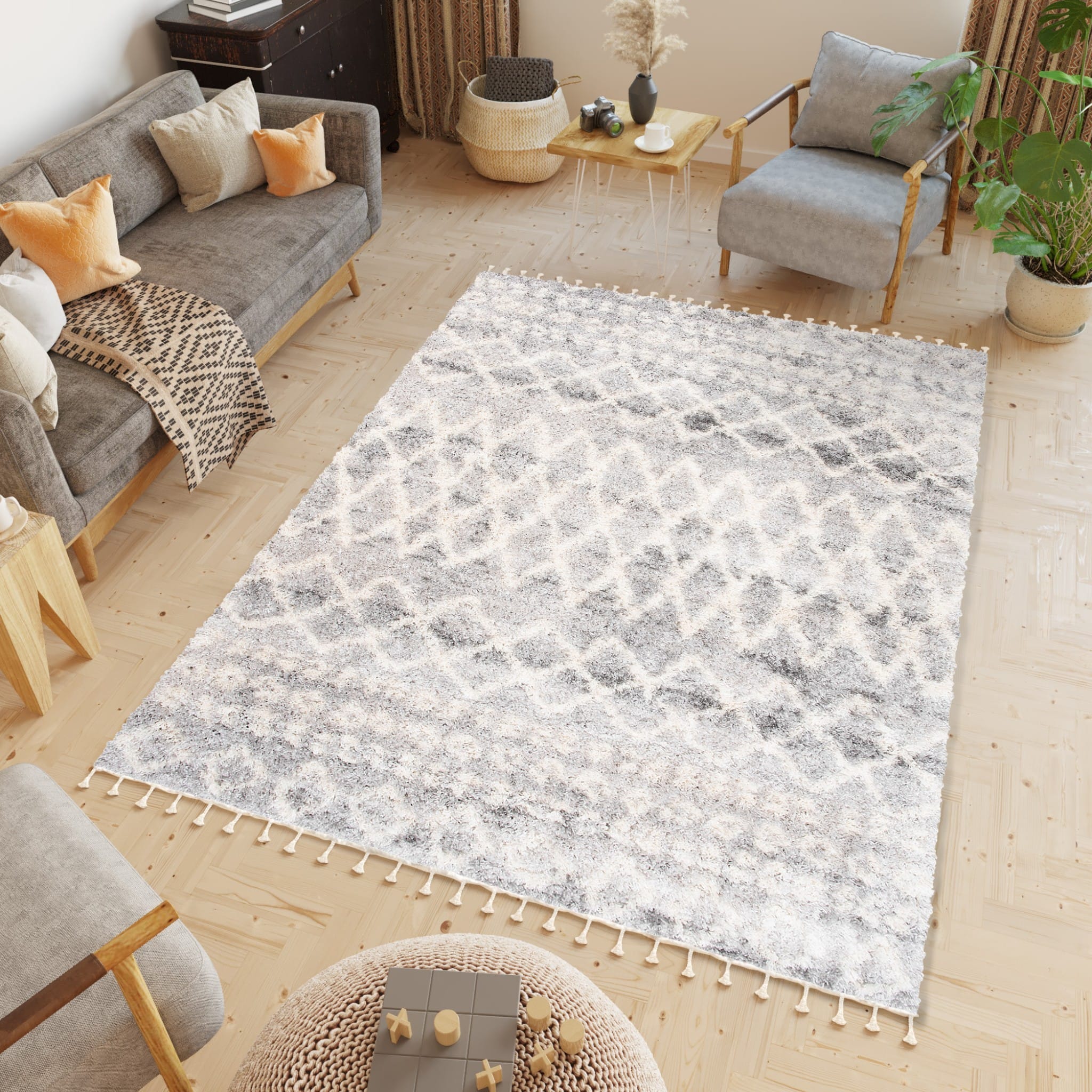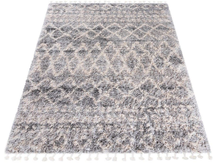 Dywan ALGIER to miękki dywan z wysokim i gęstym runem. Doskonale nadaje się do salonu, sypialni czy do pokoju dziecięcego. Runo składa się z puszystych włókien, które są wyjątkowo przyjemne w dotyku i przy tym odporne na zagniecenia. Gęstość i wysokość runa odpowiada również za jego bardzo dobre właściwości izolacyjne. Jego dodatkowym atutem jest brak elektryzowania się w trakcie użytkowania, ponieważ jego włókna wykazują właściwości antyelektrostatyczne. Dzięki technologii uszlachetnienia przez termiczną stabilizację przędzy zachowuje wytrzymałość i piękny wygląd na lata. Dywan jest łatwy do utrzymania w czystości. Można poddawać go zabiegom czyszczenia – odkurzaniu i praniu szamponami do dywanów. W kolekcji dywanów  znajduje się szeroka gama nowoczesnych i geometrycznych wzorów z efektownym ozdobnikiem w postaci frędzli.