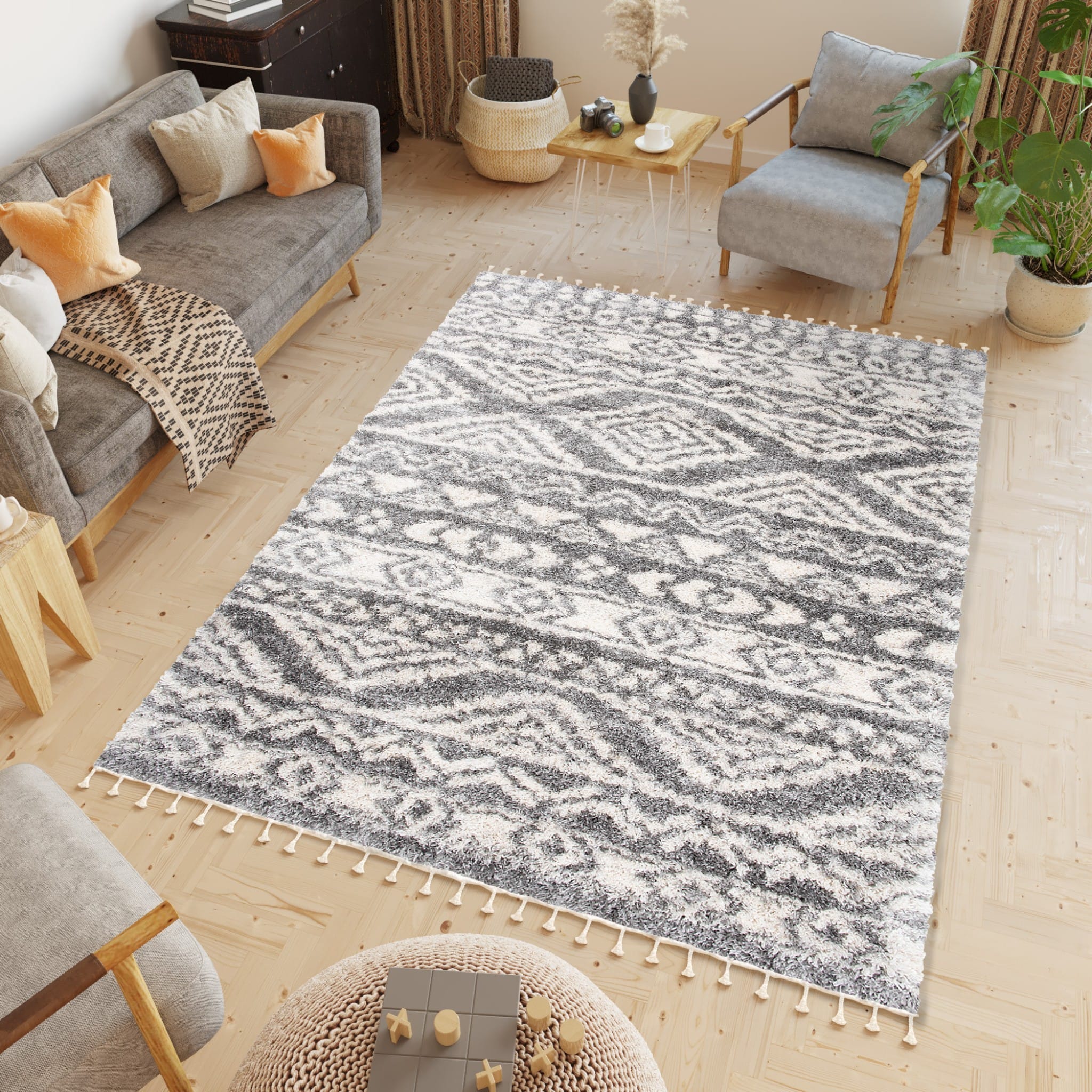 Dywan ALGIER to miękki dywan z wysokim i gęstym runem. Doskonale nadaje się do salonu, sypialni czy do pokoju dziecięcego. Runo składa się z puszystych włókien, które są wyjątkowo przyjemne w dotyku i przy tym odporne na zagniecenia. Gęstość i wysokość runa odpowiada również za jego bardzo dobre właściwości izolacyjne. Jego dodatkowym atutem jest brak elektryzowania się w trakcie użytkowania, ponieważ jego włókna wykazują właściwości antyelektrostatyczne. Dzięki technologii uszlachetnienia przez termiczną stabilizację przędzy zachowuje wytrzymałość i piękny wygląd na lata. Dywan jest łatwy do utrzymania w czystości. Można poddawać go zabiegom czyszczenia – odkurzaniu i praniu szamponami do dywanów. W kolekcji dywanów  znajduje się szeroka gama nowoczesnych i geometrycznych wzorów z efektownym ozdobnikiem w postaci frędzli.
