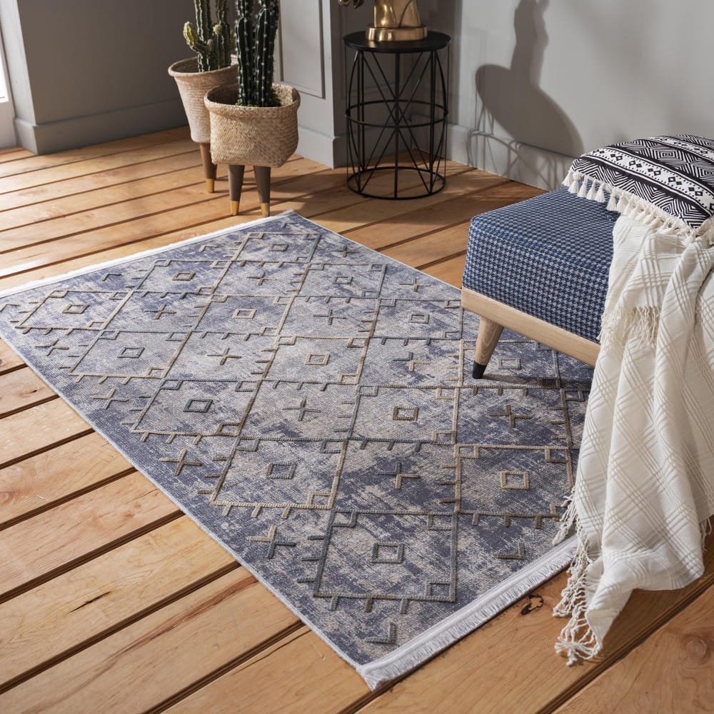 Odkryj niezwykły dywan HOMARI, stworzony, by uwieść Twoje zmysły. Wykonany z najwyższej jakości naturalnych włókien bawełny z wyjątkowym dodatkiem włókna poliestrowego, ten bawełniany dywanik to arcydzieło współczesnego wzornictwa. Jego wszechstronność sprawia, że idealnie wpasuje się w wnętrza o różnorodnych stylach, od nowoczesnych po boho i vintage. Niebanalne wzory i wyrazista, ponadczasowa niebieska kolorystyka dywanu HOMARI zapewnią Ci niepowtarzalny akcent w Twoim domu. Odporność na blaknięcia kolorów, odkształcenia i ścieranie to gwarancja trwałości tego wyjątkowego produktu. A dzięki możliwości prania w pralce w temperaturze 30 stopni (program delikatny), utrzymanie dywanu w nieskazitelnej czystości jest proste i wygodne. Nie musisz się martwić o to, że dywanik będzie się przesuwał lub podwijał – nasz dywan HOMARI został wyposażony w antypoślizgowy spód, który gwarantuje doskonałe przyleganie do podłoża. Teraz możesz cieszyć się nie tylko pięknem, ale także funkcjonalnością tego wyjątkowego dywanu. Zainwestuj w przepiękny dywan HOMARI i stwórz niezapomnianą atmosferę w swoim wnętrzu. Wybierz jakość, styl i niezawodność, które zapewniają nasze produkty.